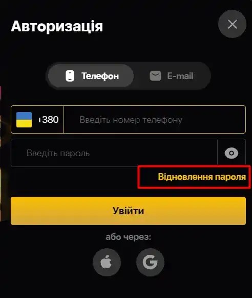 В декспотній версії та в застосунку кнопка входу розміщена в правому верхньому кутку сайту, а в мобільній версії — у лівому. Якщо не вдається увійти перевірте правильність даних або ж запросіть відновлення пароля. Для цього натисніть на відповідну кнопку та введіть телефон чи email, в залежності обраного раніше способу реєстрації.