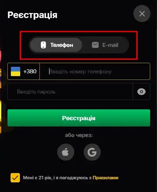 Зареєструватися в казино можуть всі, кому виповнилося 21+, за умови, що не існує інших обмежень (недієздатність, заборони/обмеження згідно з законодавством та ін.). Казино пропонує 4 метода реєстрації на вибір: телефон, електронна пошта, Apple ID та Google.